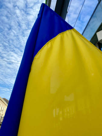 The blue and yellow Ukrainian flag flying in the sky in bright sunlight. Close-up of flag textile. The national flag of Ukraine has two equally sized horizontal bands of blue and yellow