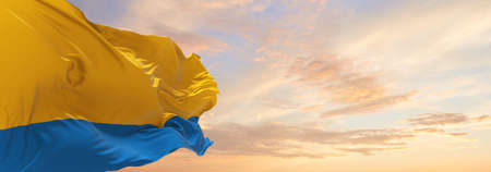 flag of Opole Voivodeship, wojewodztwo opolskie , Poland at cloudy sky background on sunset, panoramic view. Polish travel and patriot concept. copy space for wide banner. 3d illustration