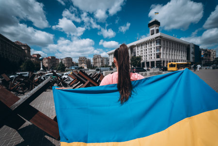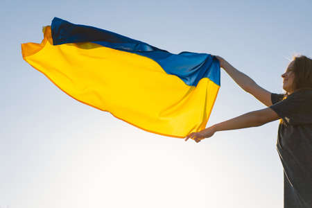 Woman holding a yellow and blue flag of Ukraine in outdoors