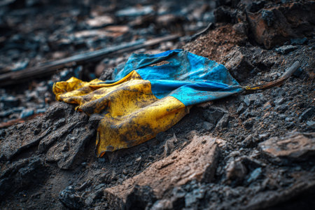 Dirty Ukrainian flag lying on devastated ground, symbolizing the devastation and consequences of war