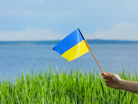 The blue-yellow flag of Ukraine develops against the background of sky. Constitution Day, Flag Day, Independence Day of Ukraine.