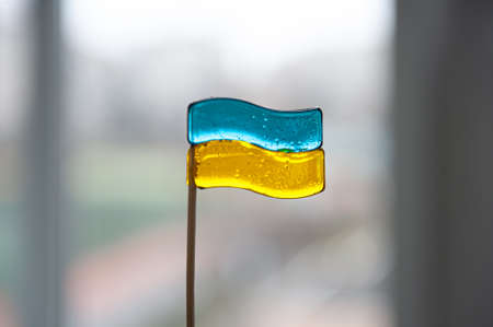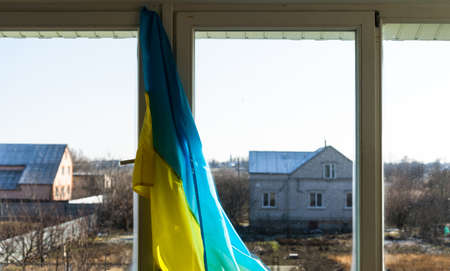 Flag of Ukraine on the window sealed with tape. No war. War in Ukraine