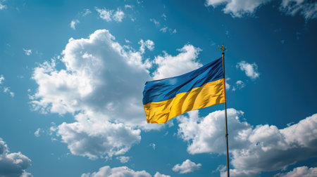 The Ukrainian flag, with its vibrant blue and yellow colors, waves gracefully against a bright white background. This striking display symbolizes national pride and resilience, capturing the essence of Ukraine's identity. The colors represent the sky and fields of wheat, reflecting the beauty of the nation.