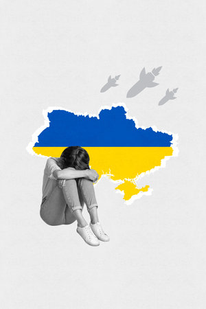 Painting template collage of scared nervous lady crying struggle every night air raid missile attack from russia pray ukraine concept