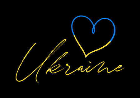 Vector illustration of Blue and Yellow heart shaped flag of Ukraine with lettering isolated on black background. Love for Ukraine concept.