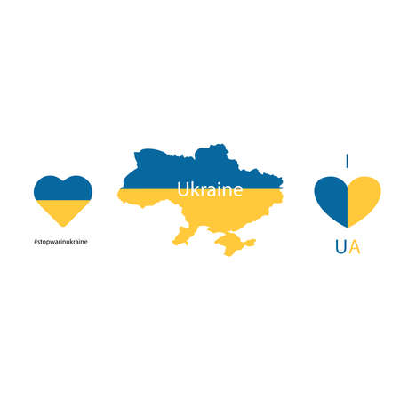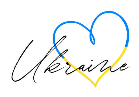 Vector illustration of Blue and Yellow heart shaped flag of Ukraine with lettering isolated on white background. Love for Ukraine concept.