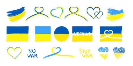 Support for Ukraine icons set in yellow blue colors. Ukrainian sign, symbol, emblem or sticker. Decorative patriotic vector elements, isolated on white background. Ukrainian hand drawn illustrations