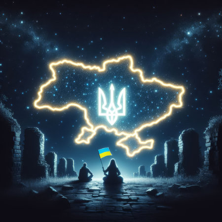 Digital artwork depicting the map of Ukraine outlined in glowing stars against a blue nocturnal backdrop, with ancient pillars framing the view.. AI Generation