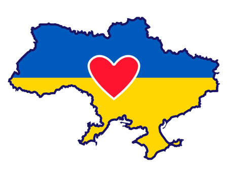 Ukraine map with national flag and red heart. country silhouette. outline color filled vector illustration