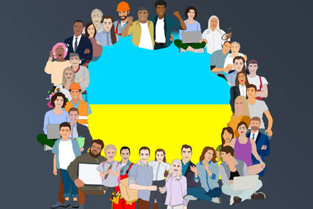 Concept or conceptual community of people forming the dangerous turn road sign on Ukrainian flag. 3d illustration metaphor for risk, warning, war, destruction and loss of lives, strategy and help