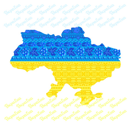 Map of Ukraine with national ethnic Ukrainian pattern inside.