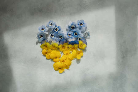 yellow and blue flowers laid out in the shape of a heart symbol of the Ukrainian flag
