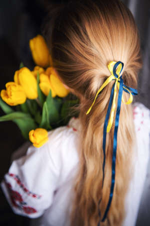 A little Ukrainian girl in traditional clothes holds a yellow tulips in her hands. Support for Ukraine. stop the war.