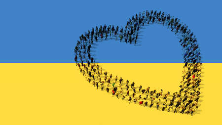 Concept or conceptual community of people forming the like icon on Ukrainian flag. 3d illustration metaphor for on-line support, social media, communication, volunteer groups, help, kindness and care