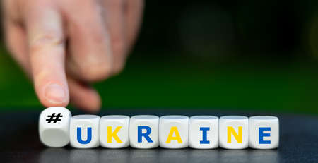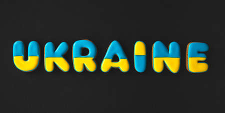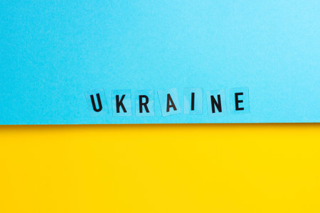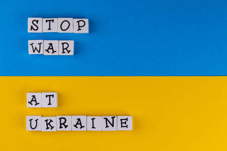The sentence Stop war at Ukraine composed of letters on the background of Ukrainian flag. Photo taken under artificial, soft light