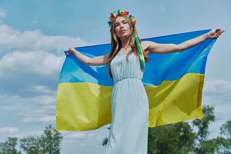 Teenage girl in vyshyvanka with flag of Ukraine outdoors