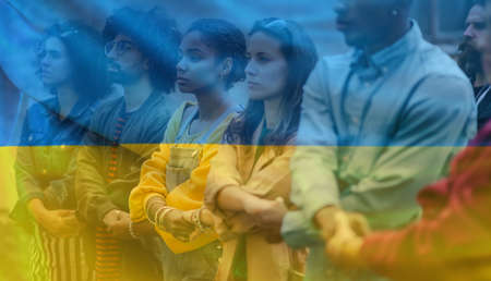 Double exposure of protestors protesting against war in Ukraine and Ukrainian flag.