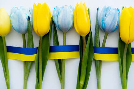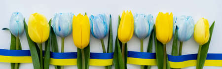 Top view of row of blue and yellow tulips and ribbon on white background, banner