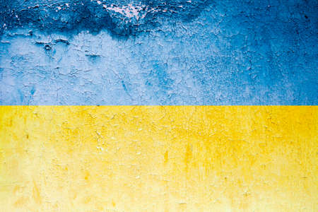 Flag of Ukraine on old grunge wall blue yellow color. Peeled paint on a concrete wall. Ukrainian culture, national sign