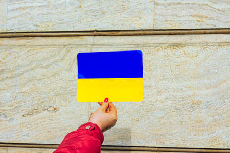 A hand with Ukrainian flag on a beige background. Support Ukraine.