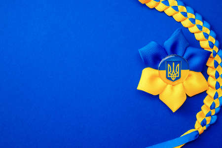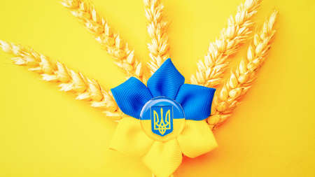 Ukraine background. Ukrainian flower trident symbol with wheat grain ear isolated on yellow banner. Flat lay, copy space