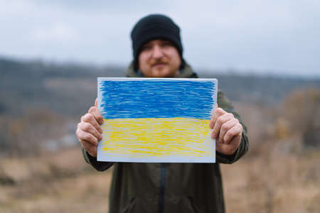 Ukrainian man holds a painted flag of Ukraine. War of Russia against Ukraine.
