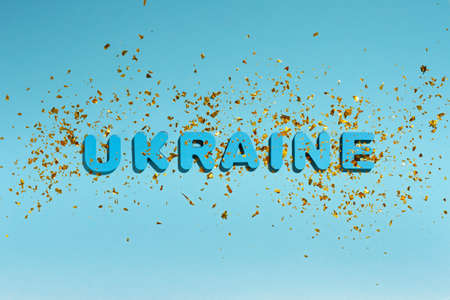 Outline of the country Ukraine, decorated in blue and yellow colors, like the national flag of Ukraine. Independence, flag, Constitution Day. War in Ukraine.