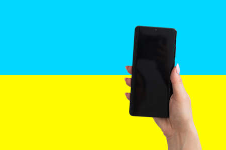 Illustration of a hand holding a smartphone with the flag of Ukraine