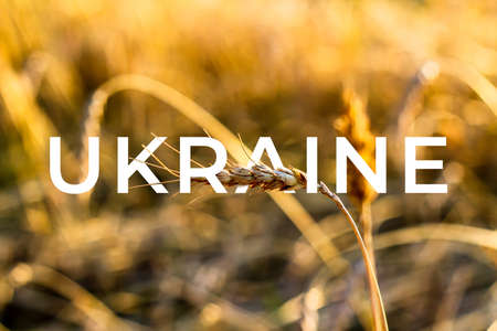 Ukraine war. Spikelets gold color, backlit, natural summer background. Photo of wheat field at sunrise sun burst. glitter overlay