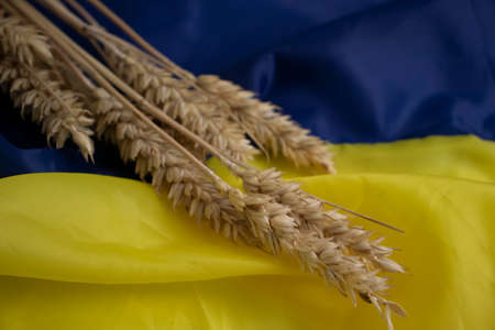 Sheaf of ripe wheat on national Ukrainian flag, top view