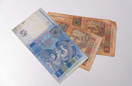 Close up 1000 Ukrainian money hryvnia on white background. Business flat lay with copy space for text. Crisis and problem of financial turbulence, inflation, devalvation, economics depression.