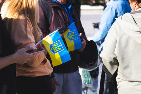 Crowd of activists protesting against Russian military invasion in Ukraine walking in street.