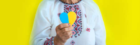 Grandmother is a Ukrainian patriot in an embroidered shirt. selective focus.