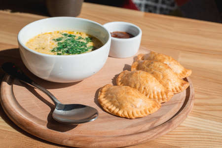 Russian dumplings in a broth with rye bread and herbs on a wooden tray