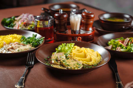 Tasty, healthy food. Beautiful restaurant serving different dishes.