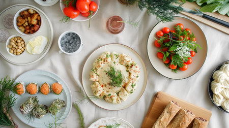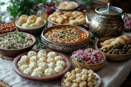 A table topped with plates of food and bowls filled with bread, AI