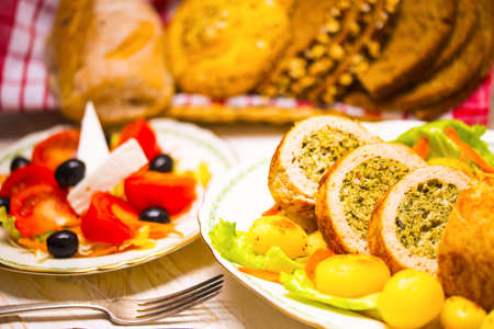A table with food served with dishes for guests.