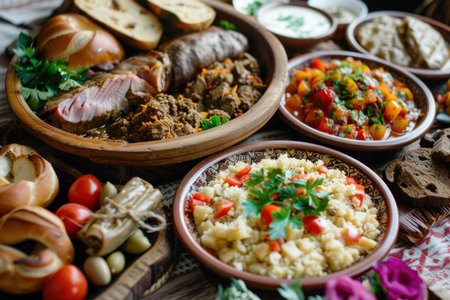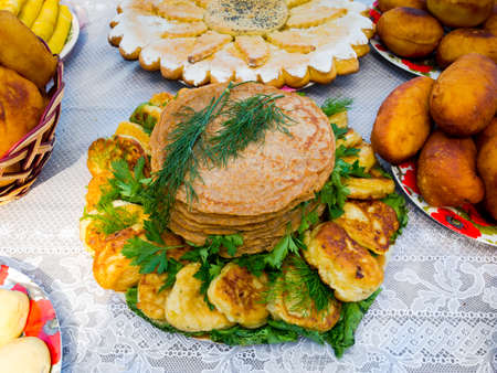 Traditional ukrainian food in assortment in festive decorating