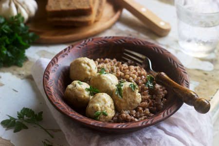 Meatballs in sour cream sauce, served with buckwheat porridge, bread and garlic. Rustic style.