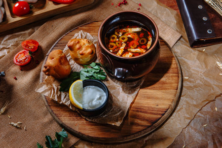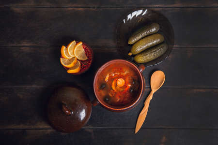 Homemade Traditional Russian soup Solyanka with meat, sausages, vegetables, pickles and olives with lemon in ceramic pot with wooden spoon on dark wooden background, top view flatlay