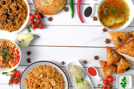 The concept of oriental cuisine. Assorted Uzbek food set, pilaf, samsa, lagman, manta, shurpa Uzbek restaurant concept, Uzbek food. Homemade Uzbek pilaf or plov from lamb served in cast iron cookware.