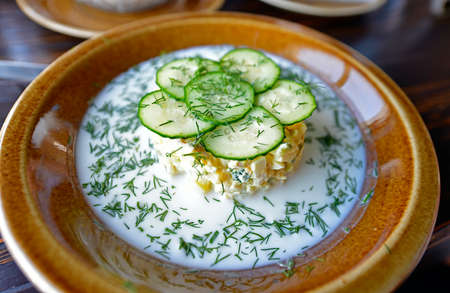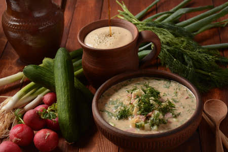Russian cuisine- Okroshka, Summer light cold yogurt soup with cucumber, radish, eggs and dill with sour cream and green onion on a wooden table.