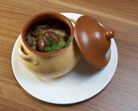 Russian vegetable vegetable stew with mushrooms in ceramic pot