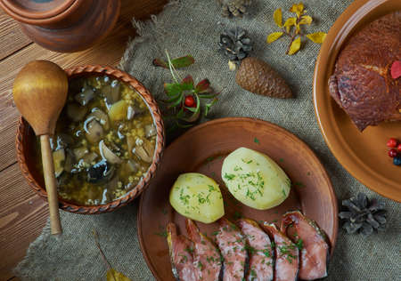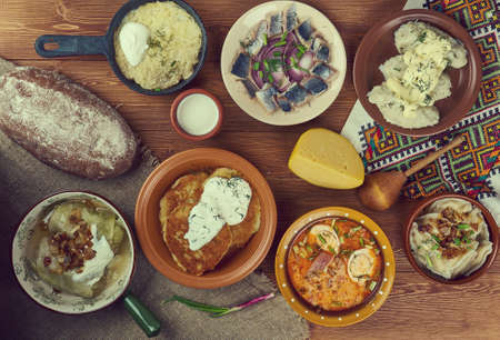Lithuanian cuisine, Baltic Traditional assorted dishes, Top view.
