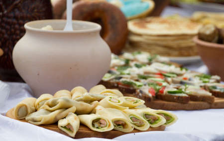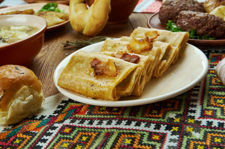 Nalysnyky, Rolled pancakes , crepes with different fillings, Ukrainian cuisine, Traditional assorted dishes, Top view.
