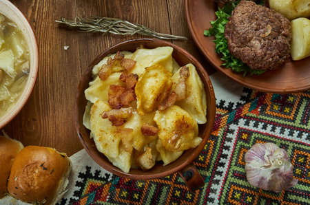 Varenyky, filled dumplings of Central European, Ukrainian cuisine, Traditional assorted dishes, Top view.