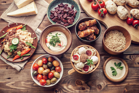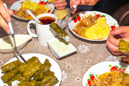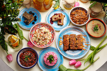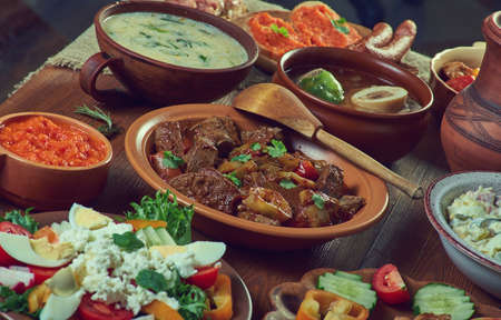 Bulgarian national cuisine, Traditional assorted Balkans dishes, Top view.