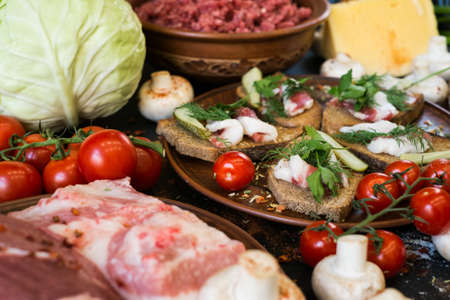 cheeses, Lithuanian cuisine, Baltic Traditional assorted dishes, Top view.