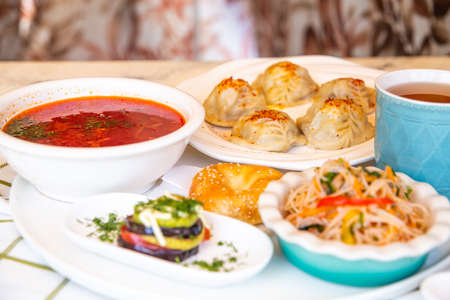 Georgian lunch borscht with salad on the table