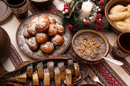 Traditional Ukrainian Christmas Eve dinner with kutia dumplings fish and pampushky. top view.